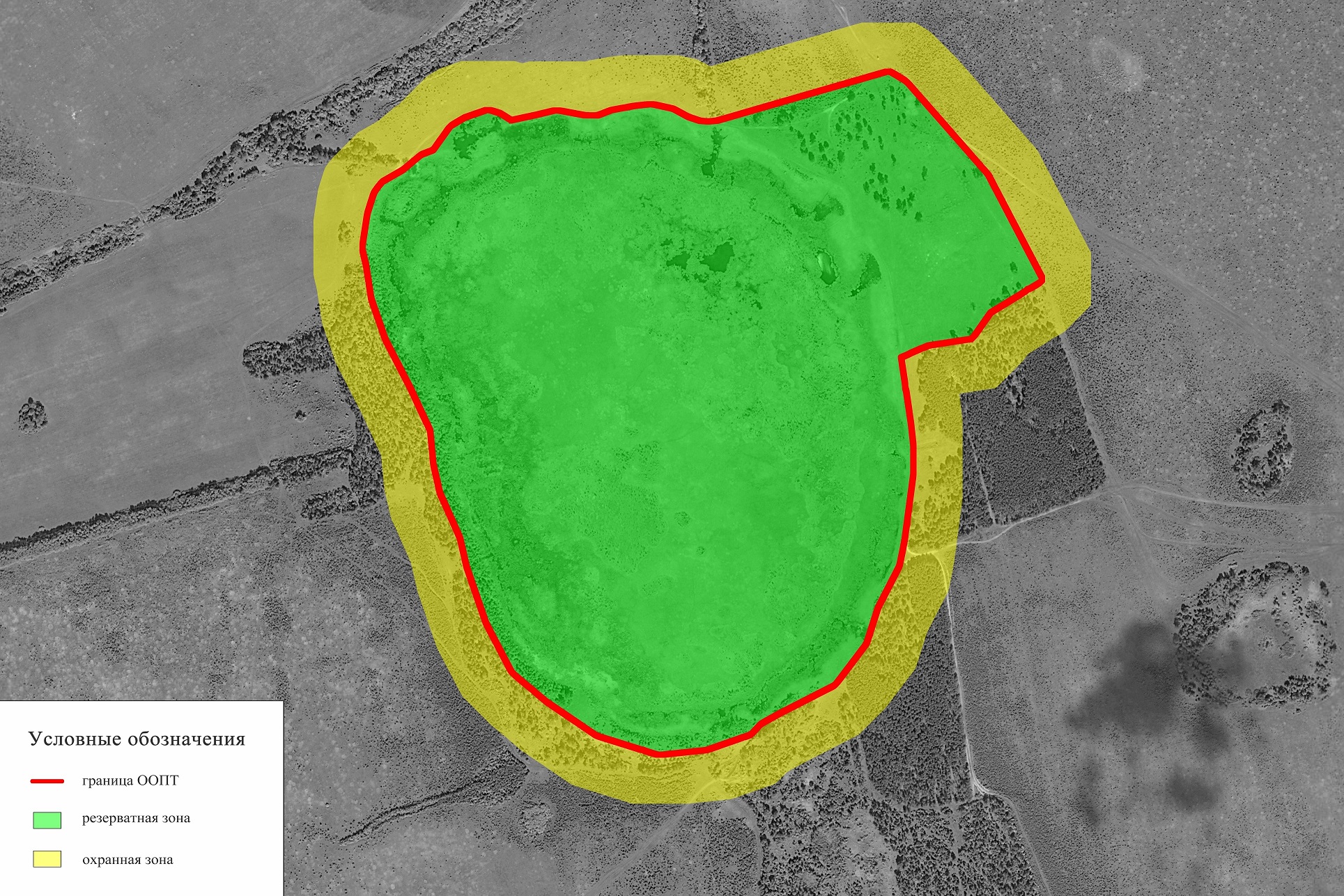 - Охранная зона служит для сохранения водоохранных лесов и луговых участков в окрестностях болотного массива и поддержания экологического баланса болотных экосистем. Составляет 100 м от края ООПТ. Здесь запрещается любая хозяйственная деятельность, противоречащая целям создания зоны, в том числе: